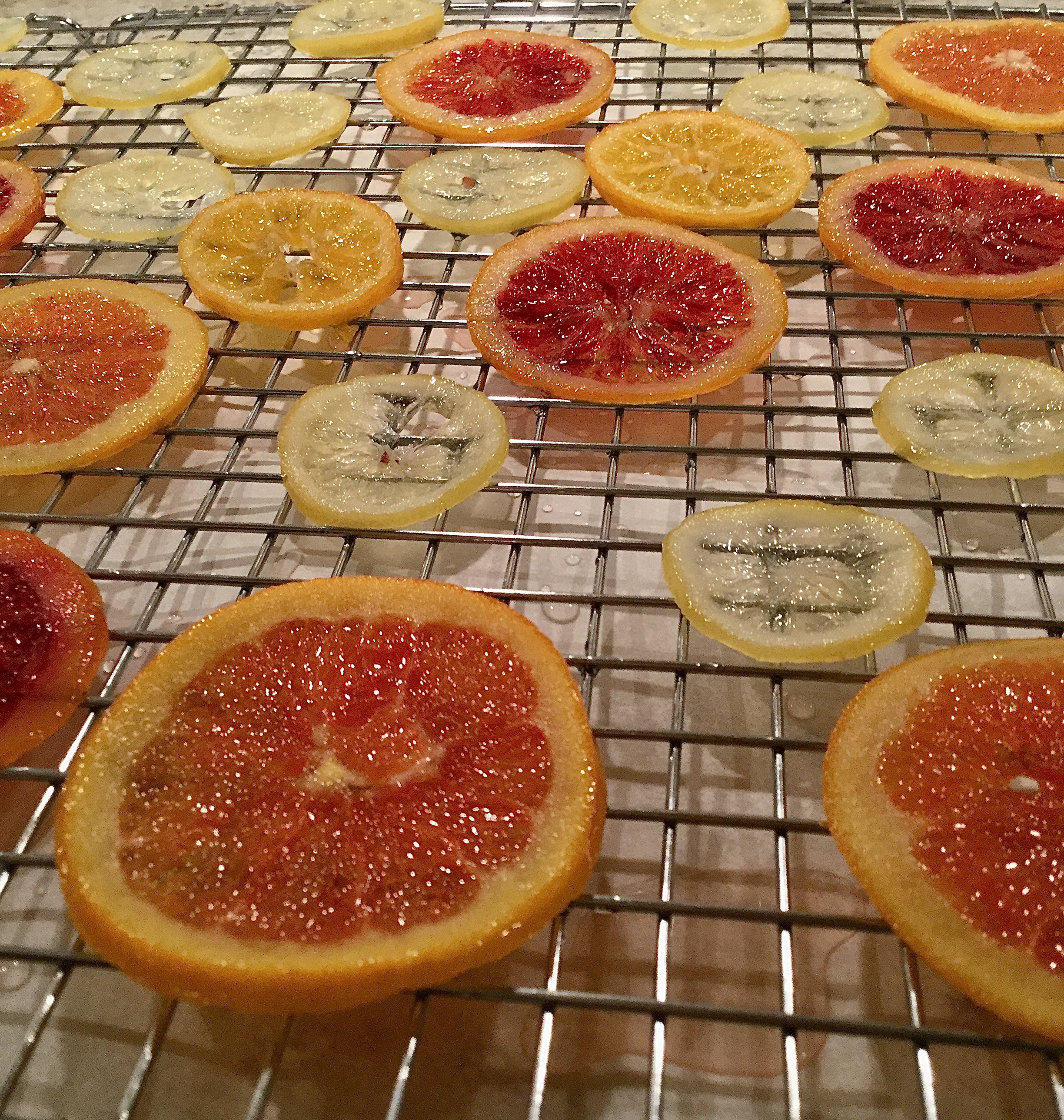 - When the rinds of the citrus begin to turn translucent, remove the citrus from the syrup. Lay to “drip dry” on a wire rack with parchment paper underneath for several hours. **You can coat your citrus in additional white sugar at this stage if you want a “sugared” appearance.**