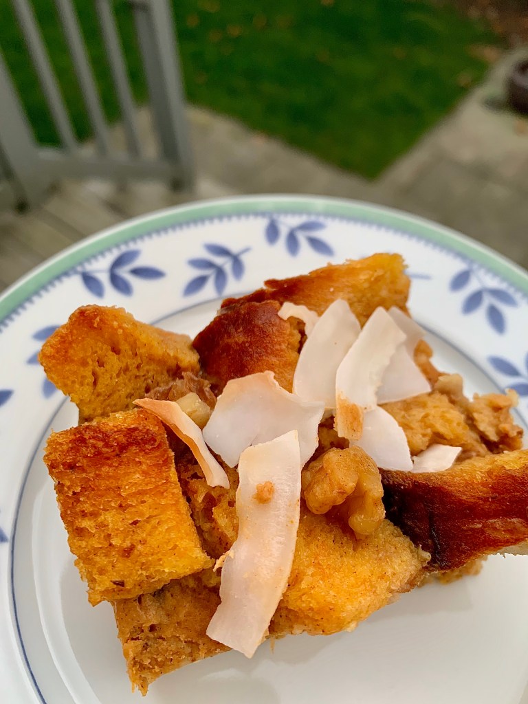 Step 4. When ready to cook, preheat oven to 350 degrees F. Bake for about 30 minutes, sprinkle toasted walnuts and coconut over top. Bake for an additional 15-20 minutes, until pudding is set.
